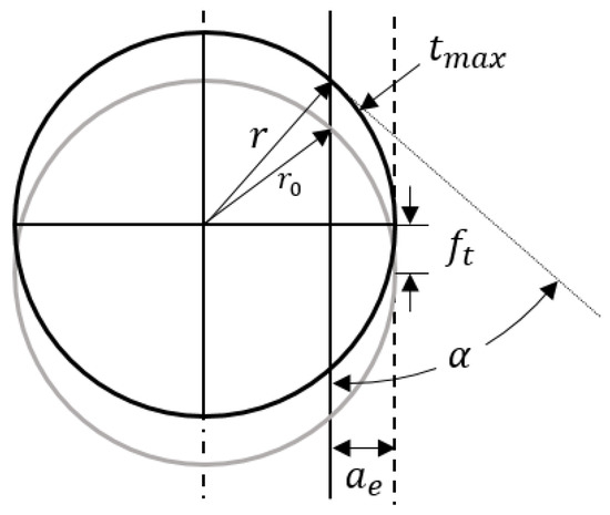 The maximum thickness and engaging angle of the uncut chip can be calculated based on the cutting conditions. The trochoidal trajectory of the tool tip is approximated as consecutive circles. With linear tool path, the uncut chip engaging angle α can be shown as: