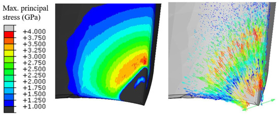 Predicted maximum principal stress of the end mill and corresponding directions.