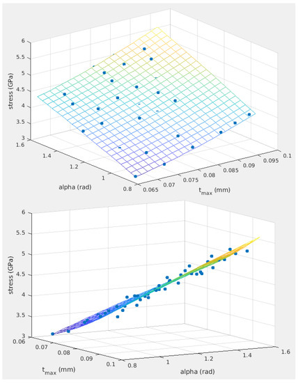 The regression model and the tool stress data predicted by FEM model are plotted in Figure 5 using Matlab (R2019a, MathWorks, Natick, MA, USA). The model’s R-squared value is above 96%, which means the model is accurate. It is found that tool stress under any cutting conditions with 0.3 mm axial depth of cut can be estimated based on the maximum thickness and engaging angle of the uncut chip through a multiple linear regression of the simulation results. Based on the model, maximum tensile stress of the cutting tool under various radial cutting depths and tool paths can be evaluated.