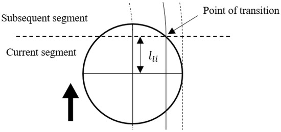 where is the spindle speed. At the transitions between the segments of tool path, the cutting tool experiences varying maximum thickness and engaging angle of the uncut chip. The lower scheduled feed rate of the adjoining tool path segments was used for each transition. The length of the transition at the end of the tool path segments can be derived through calculating the position of the tool when the tool tip reaches the end of the current segment. For linear segments as demonstrated in Figure 6, the transition length can be expressed as: