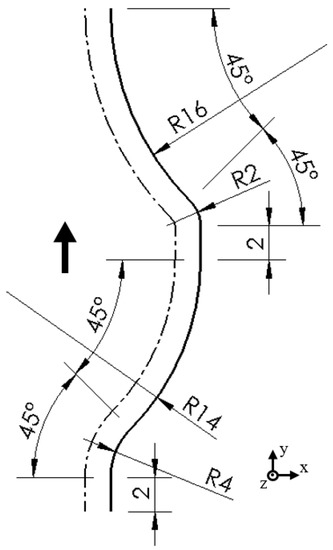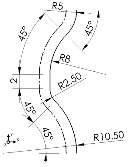 Another tool path with 1.2 mm radial cutting depth and convex curvature was investigated. The axial cutting depth was 0.3 mm and the spindle speed was 3000 rpm. The target contour and the corresponding tool path are shown in Figure 13.
