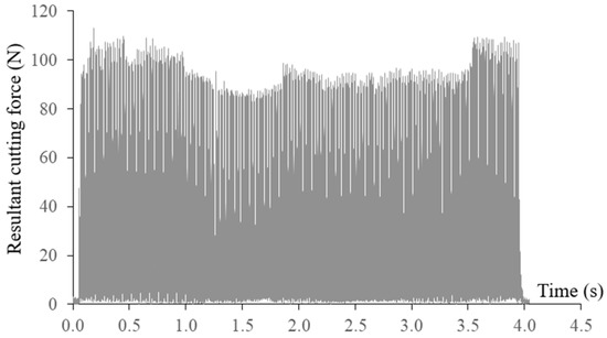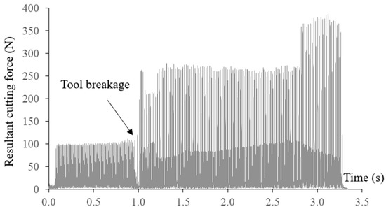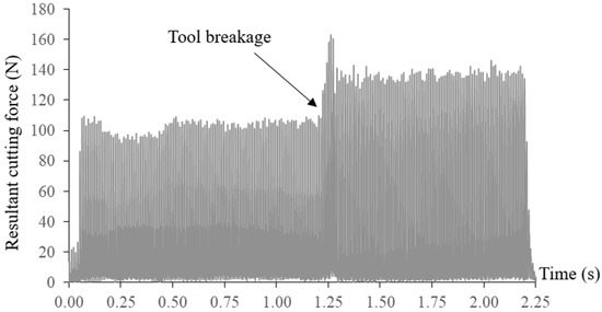 The measured resultant cutting force and axial cutting force at a constant feed rate of 900 mm/min are shown in Figure 9. Breakage of the end mill can be easily identified due to significant increases in the cutting forces. Tool breakages happened at the arc interpolation segment with the smallest radius of 0.5 mm, which can also be observed from the machined surface. The broken tool was also inspected as presented in Figure 10. Tool breakages happened on both flutes of the end mill. Through the regression model, tool breakage could be accurately predicted even without conducting the actual FEM simulation.