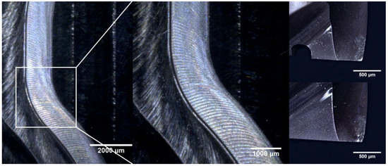 With the feed rate scheduling method, decreases of measured cutting forces were observed without tool breakage as shown in Figure 17. The machined surface and the condition of the end mill after machining are presented in Figure 18. Tool wear was observed at the tips of the end mill.