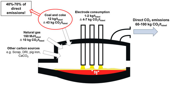 Looking at values of direct CO2 emissions of EAF steelmaking compiled in studies for the European Commission the benchmark is given with 59 kg CO2/t steel [20] while the average is given with 102 kg CO2/t steel [21]. Based on these values, the use of fossil coal in the EAF, besides the use of natural gas and the graphite electrode consumption, is causing about 40–70% of the direct CO2 emissions of the EAF steelmaking process. Figure 1 shows a schematic of carbon input and direct emissions of the EAF.