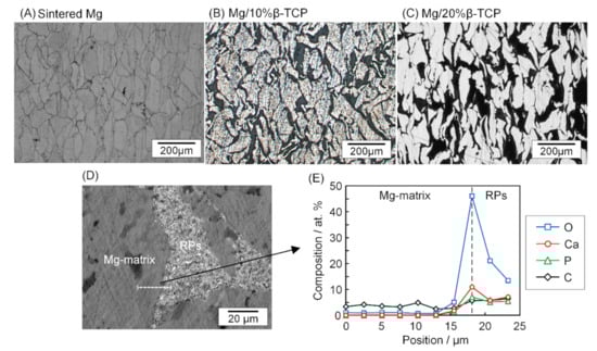 Optical micrographs of the (A) sintered Mg, (B) Mg/10% β-TCP, (C) Mg/20% β-TCP before immersion, (D) SEM image of the Mg/10% β-TCP showing the interface between Mg matrix and reaction products (RPs) area, and (E) line analysis of EDS across the interface. The balanced concentration of Mg was not shown in (E) (D and E are reproduced from our previous work [34], copyright permission obtained).