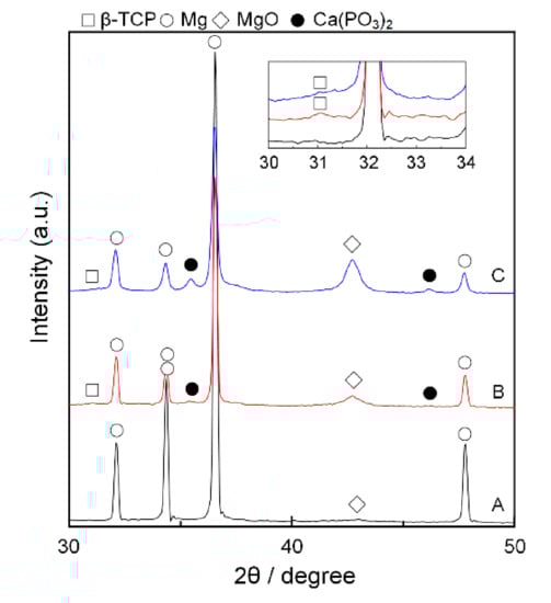 The formed RPs were characterized by XRD as shown in Figure 2. The Mg/10% β-TCP and Mg/20% β-TCP showed Mg, β-TCP, and MgO peaks. The peak intensities increased as increasing β-TCP fractions. The peak positions of MgO for Mg/10% β-TCP and Mg/20% β-TCP were shifted to low angles compared with that for sintered Mg. The sintered Mg also showed the MgO peak. Native oxide layers of Mg particles and oxygen residue in the SPS process may form MgO along the boundaries of Mg particles. This is supported by our observations of high oxygen concentrations on the boundary of sintered Mg particles (Figure S3 in the Supplementary Materials). The small peaks at 35.4 and 46.2 were possibly derived from Ca(PO3)2.