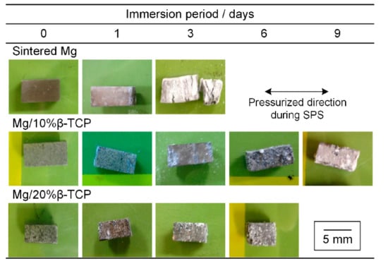Figure 3 shows macrographic images of the specimens before and after the immersion test. The white degradation products covered the sintered Mg after one day of immersion and became thicker after three days. Large cracks were observed perpendicular to the pressing direction in the SPS process (i.e., longitudinal direction). Some specimens of sintered Mg after three days of immersion broke apart due to the large cracks. In contrast, the Mg/10% β-TCP and Mg/20% β-TCP showed the locally deposited white degradation products and the area covered by the white degradation products increased as the immersion period increased. After six days of immersion, some particles detached from the bottom corner of the Mg/20% β-TCP specimen. Since the sintered Mg was fractured after three days of immersion and the Mg/20% β-TCP showed fragmentation after six days of immersion, immersion tests were not conducted for longer periods with the sintered Mg and Mg/20% β-TCP. After nine days of immersion for the Mg/10% β-TCP, the white degradation products covered its entire surface, and no fragmentation occurred.