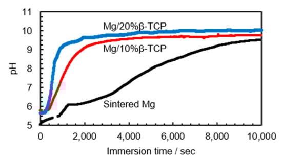 Figure 5 shows in situ pH change of the physiological saline for the initial 2.5 h of immersion. The pH of saline with the Mg/β-TCP composites increased rapidly in the beginning and reached slowly around 10, in contrast to a gradual increase for the sintered Mg. In particular, the Mg/20% β-TCP exhibited more rapid pH increment than the Mg/10% β-TCP. Furthermore, pH measurement after the immersion for any prescribed periods (1, 3, 6, and 9 days) showed stabilized pH, around 10.5, for all the samples.