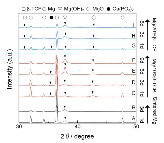 XRD patterns of samples of the (A) sintered Mg after immersion for 1 day and (B) 3 days; (C) Mg/10% β-TCP after immersion for 1 day, (D) 3 days, (E) 6 days, and (F) 9 days; (G) Mg/20% β-TCP after immersion for 1 day, (H) 3 days, and (I) 6 days. Peaks on each pattern were labeled by solid triangles except for Mg, which is seen in all patterns.
