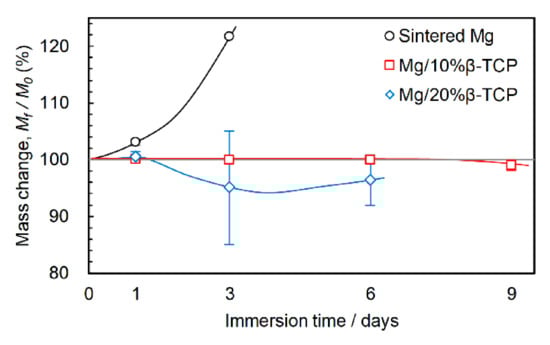 Figure 8 shows mass change after the immersion test. The sintered Mg showed a remarkable mass increase by 21.6% after three days of immersion. In contrast, the mass of the Mg/10% β-TCP was stable until six days and then decreased slightly. The Mg/20% β-TCP showed a marginal mass increase after one day of immersion and then a subsequent decrease after three days of immersion. The mass nearly stabilized between three and six days.