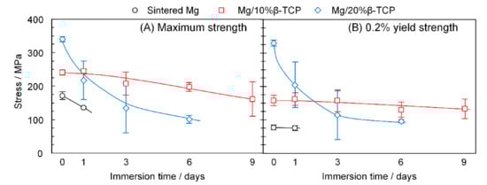 Figure 9A,B show changes in the maximum compressive stress and 0.2% yield stress as the immersion period increased. Before immersion, the Mg/ β-TCP composites showed considerably enhanced initial strength compared with the sintered Mg. The Mg/20% β-TCP exhibited a maximum compressive strength two times higher and 0.2% yield strength four times higher than those of the sintered Mg.