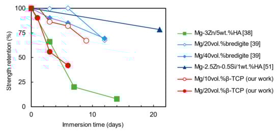 Figure 11 shows comparisons of strength retention of Mg-based composites [38,39,51]. Strength retention was calculated by dividing the strength change by the initial ultimate compressive strength before degradation for ultimate compressive strength. The ultimate compressive strength before and after degradation is shown in Figure S4 in the Supplementary Materials. The loss of mechanical strength of Mg/10% β-TCP composites is comparable with other reported Mg-based composites. Interestingly, strength retention rate can be categorized into two groups by their rates: low strength retention group, including Mg/20% β-TCP and Mg-3 Zn/5 wt.%HA, and high strength retention group, including the others. It may be interesting to perform a systematic study to assess the mechanical integrity of Mg-based composites.
