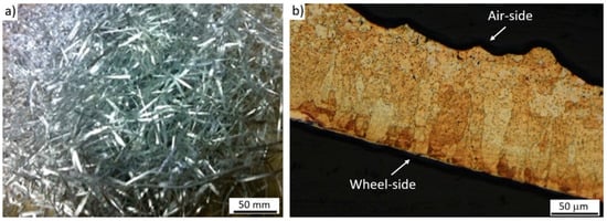 To achieve the high strength and corrosion resistance of the aluminum alloy, the melt is rapidly solidified in the form of ribbons and further plastically consolidated using extrusion at elevated temperature. Different chemical compositions of the alloys were prepared and melt spun. The products of melt spinning are typically ribbons, approximately 3 mm wide and 50–120 µm thick, as shown in Figure 2a. The melt-spun ribbons were characterized in the longitudinal direction. An etched LM image reveals the microstructure of the RS aluminum alloy (Figure 2b). Columnar grains appeared on the side where the melt touched the copper wheel. The ribbon’s surface on this side is flat and the precipitates are very small and not directly visible in LM micrographs. They are seen as etched pits due to the corrosion attack of the small precipitates. The ribbon’s surface on the air side is not flat, but rougher and in cross-section shows a wave-like appearance. On this side of the ribbons the grains are smaller and polygonal with larger precipitates, seen as dark dots. The wheel side of the ribbons has a faster cooling rate, which means the solidified melt is supersaturated. The TM alloying elements like Fe and Mn remain in a solid solution and the precipitates are much smaller. The grains are columnar and the growth direction is defined by the direction of the heat gradient, which is perpendicular to the copper wheel. The very fast cooling rate causes no precipitation during the crystal growth and this is the reason why the grains are larger. While the air-side ribbons solidify more slowly and the precipitates have more time to grow. This part of the ribbons is at a certain point still liquid and has many precipitates, which are seeds for the crystallization. That causes the formation of many small grains that begin to grow at almost the same time.