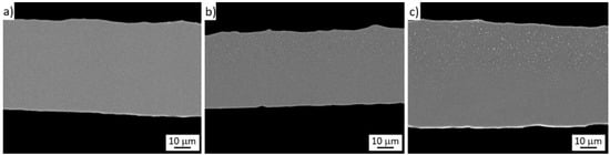SEM images reveal the microstructure of ribbons even better. Depending on the chemical composition, some ribbons have less or no precipitates, as shown in Figure 3a, where there is a cross-section of the ribbon with no addition of Fe and/or Mn. The addition of TM elements, Mn in Figure 3b and Mn and Fe in Figure 3c, causes more precipitation. As already described for Figure 2b, the majority of ribbons have larger precipitates on the air side; however, it sometimes happens that the ribbons touch each other or the time of the contact with copper wheel can be different. Due to very uneven conditions during melt spinning, the large precipitates are not always on the air side.