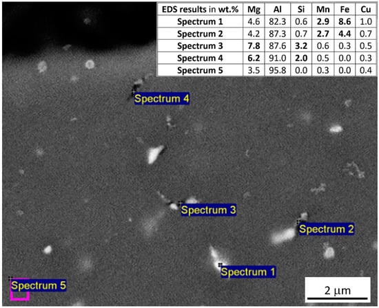 TEM BF micrographs were recorded for all three studied samples and both wheel-side and air-side areas. In all the studied areas small precipitates were present and the amount of those precipitates increased with the addition of TM elements. TEM/EDS analyses were performed and in Figure 5 is a TEM BF micrograph with a lot of nanosized precipitates of the sample RS AA5083 with Mn and Fe. In the TEM BF micrographs, large amounts of precipitates based on AlMnFe (Al6(Mn,Fe) phase) are present in a spherical shape of 50 nm and needles of 50 nm thick and approximately 100–500 nm long. Those precipitates are formed because of the supersaturated TM elements in the rapidly solidified aluminum matrix. They were also studied by Stan-Glowinska et al. [3].
