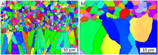 The grain morphologies of the as-melt-spun and the annealed ribbons are clearly seen from the EBSD inverse pole figure in the Z direction (IPF-Z) map (Figure 6), similar to the findings of Tewari [16] using different alloy. The as-melt-spun ribbons in contact with the rotating wheel have larger and columnar grains. The other part solidified subsequently and has a much finer, polygonal grain structure (Figure 6a). Because the solidification starts at a large number of seeds at the same time, a very fine grain structure appears, with polygonal shapes. Due to the different solidification conditions of the ribbons, the bimodal structure is obtained. In the literature [2], quite often the formation of fine grains is correlated with the wheel side, because this part of the ribbons is much more quickly cooled and solidified, which seems to be contradictory. The very flat surface of the ribbon is undoubtedly proof of wheel side, which is correlated with columnar grains.