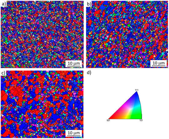 EBSD IPF Z maps of cross-section of the extruded material (a) IPF-Z of RS AA5083, (b) RS AA5083 with Mn, (c) IPF-Z of RS AA5083 with Mn and Fe, and (d) IPF legend.