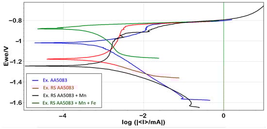 The main difference between the samples is the chemical composition and the rate of solidification (normal material extrusion and extrusion of RS material) of the alloys, which all affected the polarization potential and the passivation behavior. Before all the measurements of the corrosion parameters, 1 h of stabilization at the open-circuit potential (OCP) occurred. Corrosion potentials (Ecorr) for these samples changed quite fairly, as the RS AA5083 with Mn has Ecorr around −1.2 VSCE and RS AA5083 with Mn and Fe sample has approximately −0.86 VSCE. On the other hand, following the Tafel region, the alloys exhibited a differently broad range of passivation with practically the same breakdown potential (Eb) at around −0.83 VSCE. The passivation range is significantly narrowed, and there is almost no passive region for sample RS AA5083 with Mn and Fe, whereas the corrosion-current density (icorr) and corrosion rate (vcorr) was almost seven-times lower compared to the highest icorr and vcorr of the sample RS AA5083. In the passive range the corrosion-current densities changed for the tested specimens from 0.16 mA to almost 1.11 mA. In the active-passive transition just two of the studied specimens went into the typical passive range, RS AA5083 and RS AA5083 with Mn, whereas the other two did not exhibit a typical passive region or it was considerably narrower.