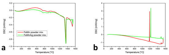 DSC results of Fe-M and Fe-Mn-Ag powder mixtures: (a) heating cycles, (b) cooling cycles.