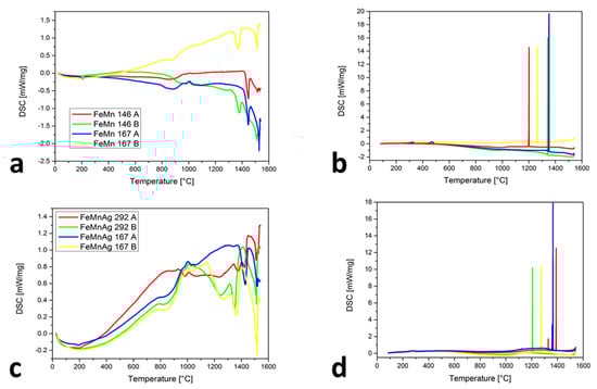 Figure 2a shows the similarities of the chemical compositions between FeMn 146 A and FeMn 167 A with the lower Mn content as well as FeMn 146 B and FeMn 167 B with more Mn. For the first two (23.8 and 23.5 wt. % Mn), the TL is higher (approximately 1420 ± 3 °C) than for the other two (46.7 and 45.4 wt. % Mn), where TL is 1346 ± 3 and 1413 ± 3 °C. It is also evident that the ε-martensite appeared at 183 ± 3 °C for both curves, but only in alloys with a lower Mn content. The claims of Mujica et al. [30] that an increase in the Mn will reduce the possibilities of ε-martensite’s occurrence were proven. The reappeared changes in the temperature interval at approximately 700 to 1000 °C were observed. An even stronger detection appeared for the samples with Ag (Figure 2c), at the onset of the Ag melting and also in this temperature interval. As predicted previously with powder mixtures, the behavior of the curves in this temperature interval is associated with the combination of susceptibility to sintering, MnO2 melting and Mn oxides transformation, as well as the αMn-to-βMn transformation. In Figure 2b,d, very narrow solidification intervals for the FeMn and FeMnAg alloys were found. The high vaporization of Mn with heating and under isothermal conditions completely changes the chemical composition of the analyzed alloys, which is evident from the Ts temperatures. They were between 1202 ± 3 and 1391 ± 3 °C. Only for the sample FeMnAg 292 A, the second peak, at around 1330 ± 3 °C, appeared and probably belongs to the Mn oxides’ transformations. The ε-martensite appeared only in the samples where the Mn content was low enough. The reason for the temperature differences in the ε-martensite’s start could be the range of the chemical composition or the fact that the ε-martensite can occur athermically [31], which means that for the phase transformation, a change in the temperature is not required, but as a consequence of the phase transformation, a suppressed dislocation motion with stress delocalization is also present with the appearance of extensive phase boundaries.