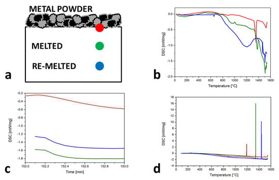 Problems with the vapor pressure differences and consequently the strong vaporization of Mn bring major challenges with respect to achieving the desired chemical composition. Especially for the SLM process, where the temperatures in the melt pool area are typically in the range of 1500 to 2500 °C [32] (but can also reach 3700 °C in the center of the laser spot [33]), the addition of Mn must be greater in the Fe-Mn powder mixture than the desired Mn content in the SLM samples. The undesirable chemical composition changes also arise from re-melting due to the SLM process, presented in the scheme (Figure 3a). The marked positions show the different melted and re-melted spots during the SLM-produced layers and the behavior of the material in these spots during the heating (Figure 3b), the isotherm (Figure 3c) and the cooling (Figure 3d). With heating cycles, the TL value increases, which means an increasingly smaller Mn content is observed after each re-melting. The above is also confirmed with 60 s of the isotherm curves (that is approximately the same as the processing time for three layers) because the DSC values were constantly decreasing. The most representative are the cooling cycles, where the Ts is much closer to the Ts of pure Fe with each re-melting.
