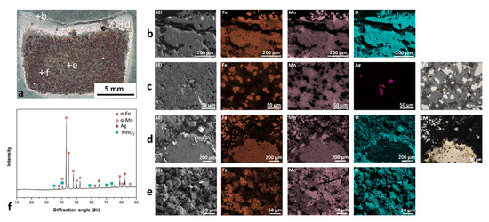Sintering test for Fe-Mn-Ag powder mixture at 850 °C for 1 h: (a) macrograph of cross-section, (b) upper fully oxidized layer, which was partly resigned, (c) area with Mn oxide and completely pure Fe areas, (d) melted part as a result of the reused powder after the SLM process, surrounded with the sintered powder mixture, (e) in the mainly well-sintered area, (f) XRD spectra of sintered Fe-Mn-Ag material.