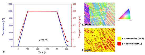The dilatometry curve (Figure 5a) shows that the ε-martensite transformation was present at low temperature (289 °C). The sintered layers and Mn oxides on the SLM samples most often occurred on the surfaces of the material. This was removed with grinding before the dilatometry tests. In that way, the Mn oxides’ transformations would not be detected by the dilatometry curve. The inverse pole figure in the Z direction (IPF-Z) in Figure 5b presents the diverse orientation of the ε-martensite needles and the γ-austenite grains. The occurrence of the ε-martensite needles or plates, which intersect each other within the large γ-austenite grains, is described by Takaki et al. [36]. In Figure 5c, the ratio between the γ-austenite with the face-centered cubic (FCC) structure and the ε-martensite with the hexagonal close-packed (HCP) structure is presented.