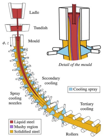 - Brimacombe, J.K. The challenge of quality in continuous casting processes. Metall. Mater. Trans. A 1999, 30, 1899–1912. [Google Scholar] [CrossRef]