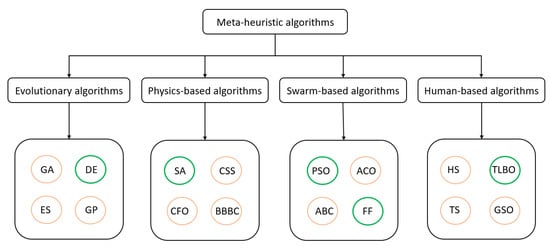 - Yang, X.S. Nature-Inspired Optimization Algorithms; Elsevier Science Publishers, B.V.: Amsterdam, The Netherlands, 2014; ISBN 9780124167452. [Google Scholar]