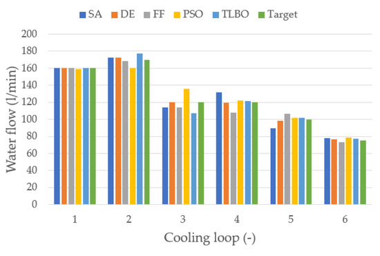 | Optimization Algorithm | Temperature Error (°C) | Loop 1 (l/min) | Loop 2 (l/min) | Loop 3 (l/min) | Loop 4 (l/min) | Loop 5 (l/min) | Loop 6 (l/min) | Total (l/min) |