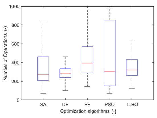 - The best median value in terms of the number of operations needed by the algorithms to reach the solution was observed for the simulated annealing (SA) algorithm (with 271 operations per run and with the convergence rate of 96%) and for the differential evolution (DE) algorithm (with 280 operations per run and with the convergence rate of 99%).