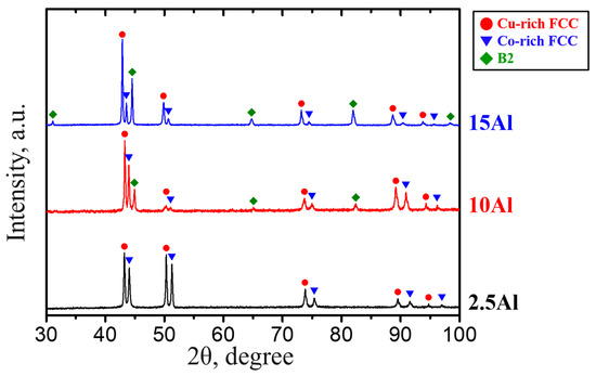 The XRD patterns of the homogenized 2.5Al, 10Al, and 15Al alloys are shown in Figure 2. The 2.5Al alloy with the smallest contents of Al and Mn exhibits dual FCC crystal structures, Co-rich FCC and Cu-rich FCC. In the 10Al and 15Al alloys, however, the peaks of the B2 phase appear as the Al and Mn contents increase. Therefore, the 10Al and 15Al alloys contain triple phases in their microstructure. According to the thermodynamic calculation (Figure 1b–d), the fraction of the B2 phase grows by consuming the fraction of Co-rich FCC because the present B2 phase is an Al-Co-ordered phase. Hence, the decline in the Co-rich FCC peaks is clearly observed in the XRD pattern of the 15Al alloy.