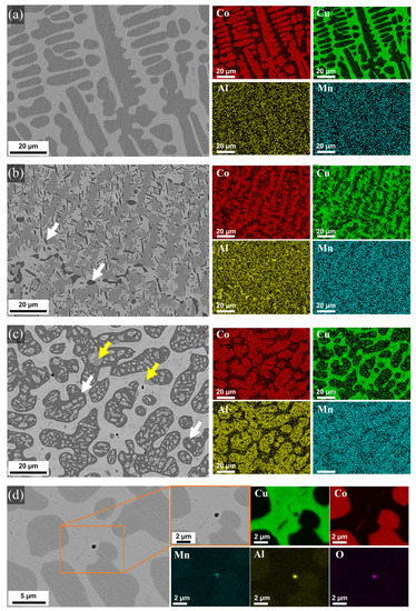 Figure 3 shows BSE images with EDS elemental maps for Al, Co, Cu, and Mn in the alloys. The dendritic Co-rich FCC and inter-dendritic Cu-rich FCC can be observed in Figure 3a. The Al and Mn are evenly distributed to dual FCC domains in the 2.5Al alloy. However, the B2 phases are formed in the 10Al and 15Al alloys, as shown in Figure 3b,c. It is noted that some nano-scale black dots, which are clarified as AlMn-rich oxide formed during casting, are also observed in the 2.5Al alloy (Figure 3d). Notably, the shape of the B2 phase is a needle-like precipitate in the 10Al alloy, while the dendritic microstructure of B2 is observed in the 15Al alloy. Most of the needle-shaped B2 precipitates in the 10Al alloy can be observed only inside the Cu-rich region (Figure 3b). From the EDS maps, the Al and Co are enriched in the B2 phase, indicating the B2 phase is Co-Al-ordered B2. Although the 15Al alloy contains a large amount of B2 phase, some Co-rich FCC phases remain, as shown in Figure 3c. The chemical composition and configurational entropy () of the constituent phases are given in Table 1. Mn contents in the Co-rich and Cu-rich domains increase with adding Mn into the alloys; however, the Al contents in the dual domains slightly decrease in the 15Al alloys accompanied by the formation of the B2 phase. Moreover, more Al and Mn are dissolved in the Co-rich FCC than in the Cu-rich FCC. The configurational entropy values of both Co-rich and Cu-rich FCC phases gradually increase with the addition of Al and Mn, leading to a mixture of the Co-rich medium-entropy phase (1.02R) and Cu-rich low-entropy phase (0.83R) in the 15Al alloy.