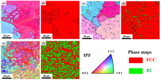 The inverse pole figure (IPF) and phase maps of the alloys are shown in Figure 4. The 2.5Al alloy shows dual FCC dendrites, which have highly coherent grain orientation relations because of the same solidification direction during cooling (Figure 4a,b). As the Al content increases, the 10Al and 15Al alloys show additional B2 phases with dual FCC domains (Figure 4c–f). The needle-shaped B2 phases are sprinkled in the 10Al alloy (Figure 4c,d), while the dendritic B2 phases exist in the 15Al alloy (Figure 4e,f). The length and width of the needle-shaped B2 precipitates in the 10Al alloy are 1.58 0.68 μm and 0.33 0.15 μm, respectively, while the size of the dendritic B2 in the 15Al alloy is 10.40 3.81 μm.