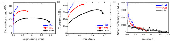 The tensile properties and strain hardening rates (SHRs) of the homogenized alloys are presented in Figure 5a–c. With the addition of Al and Mn, the YS and ultimate tensile strength (UTS) of the 2.5Al, 10Al, and 15Al alloys increases from 252.8 9.8 and 437.7 12.3 MPa (2.5Al) to 376.2 25.7 and 610.6 44.3 MPa (10Al), and 546.3 19.0 and 760.8 12.9 MPa (15Al), respectively. Simultaneously, the total elongation decreases from 65.9 7.9% to 9.1 0.3%. The formation of B2 phases enhances YS and UTS; however, it deteriorates the elongation. The SHR of the alloys improves with the addition of Al and Mn (Figure 5c). Notably, the 15Al exhibits higher SHR compared to the 2.5Al and 10Al alloys.