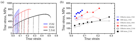 The measured effective and HDI stresses of the 2.5Al alloy are 125–250 MPa and 158–327 MPa, respectively (Figure 6b). With the increase in Al content, the HDI stress values of the alloys become higher. The HDI stress substantially enhances from 308–500 MPa in the 10Al alloy to 340–460 MPa in the 15Al alloy. The 2.5Al alloy maintains HDI stress similar to effective stress during deformation, while the 10Al and 15Al alloys show much higher HDI stress than their corresponding effective stress.