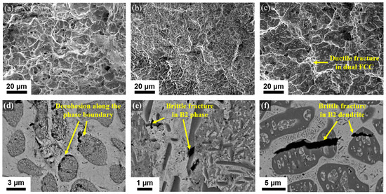 The fracture surface and the longitudinal section of the fractured samples are presented in Figure 7. It can be seen that the 2.5Al and 10Al alloys show ductile fractures. The fracture surfaces of the 2.5Al and 10Al alloys consist of numerous dimples resulted from the ductile rupture of dual FCC, as shown in Figure 7a,b. The dimple size and depth are much smaller in the 10Al alloy than in the 2.5Al alloy. In Figure 7c, the 15Al alloy shows a ductile fracture mode with a brittle fracture in the B2 phase. The magnified longitudinal sections of the fractured samples are shown in Figure 7d–f. Decohesion along the phase boundary is observed in the 2.5Al alloy (Figure 7d), while the brittle fracture modes of the B2 phases are observed in the 10Al and 15Al alloys (Figure 7e,f).