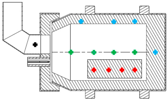 Experimental equipment (Figure 1) was constructed to monitor the melting and intensification processes of the gaseous fuel combustion process. For the design of the experimental model, a functioning model of a tilting rotary furnace was built at a geometrical scale of 1:5.2, with an inside diameter of 305 mm and length of 607 mm. The experimental model was placed at an angle of inclination of 7% during the measurements. K-type thermocouples (NiCr-NiAl) PTTK-TKb-60-2-SP (Meratex s.r.o., Košice, Slovakia) were used to measure temperatures at 13 points in the furnace. The measurement uncertainty of these thermocouples given by the manufacturer is at the level of +/−2.5 °C at the temperature of 1200 °C. One of the aims of the research was to use thermocouples to continuously monitor the changes in the temperature field in the combustion chamber, lining, stack and charge. The distribution of thermocouples in the furnace and distance from the burner in the X-axis is shown in Figure 2 and defined in Table 1.