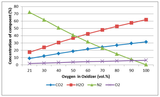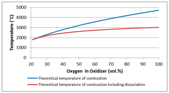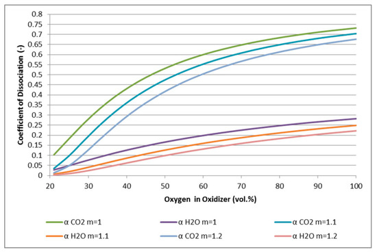Results of the mathematical model shown in Figure 7 predict the trends and values of the coefficient of dissociation depending on the oxygen enrichment concentration in the oxidizer and on the air excess. It is evident that with the oxygen concentration range of 21–30% vol. in the oxidizer and at higher air excess values, the dissociation of CO2 is negligible. This argument is well-presented in Figure 7. With increasing oxygen concentration in the oxidizer above 30% vol. a significant increase in CO2 dissociation occurs. This may then result in an increase in CO concentration in the flue gas.