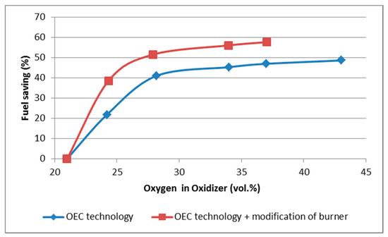 Dependence of fuel savings on oxygen concentration in the oxidant (experimental measurements).
