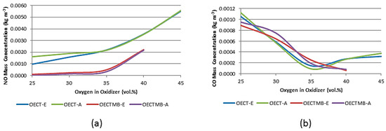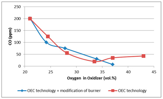 The results of the experimental measurements are presented in Figure 8. CO formation is suppressed in the range of oxygen content in the oxidant from 21% to 27% vol. for both analyzed burner designs. Compared to air combustion, higher temperatures are achieved in these measurements, which can have a positive effect on the combustion process. Better blending of the combustion mixture can also occur. Both of these effects can have a positive influence on the reduction of CO formation. In the case of utilizing OEC above 35% vol., there is a slight increase in the concentration of CO in the flue gas, which confirms the findings obtained from the mathematical model. In the case of the modified burner, the concentration of CO emissions gradually decreases.