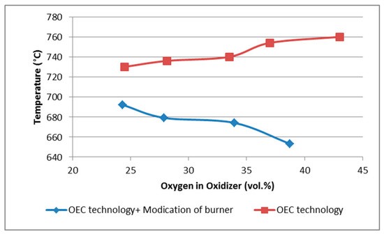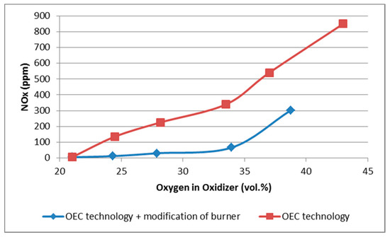 In comparison with the results presented in the study by Poskart et al. [8], lower concentrations of NOx were found during our experimental measurements. In that study, the NOx concentration was 1284 ppm at 30% oxygen enrichment in the oxidizer and burner input power of 10 kW.