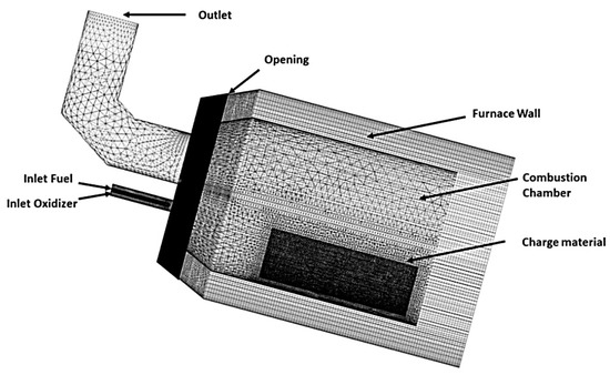 Figure 11 provides a visualization of the mesh of the CFD model. The total number of cells was 5050326. Further increase in mesh fineness did not yield any further change in simulation outputs. This model was created from tetrahedral, hexahedral and wedge cells. Meshing in the vicinity of the furnace walls and charge material was supported with the inflation function and the inflation option “Smooth transition”, a maximum of five layers and growth rate of 1.2. The worst value of y+ was 12, observed in the stack area, while in other areas it ranged from 0 to 1.5. In order to simplify the simulation model it was assumed that the charge material would not melt. The heating of the charge material was defined as the specific heat capacity of aluminum (903 J·kg−1·K−1). The melting model would require transient simulation, which is time-consuming due to the increased complexity of the CFD model.