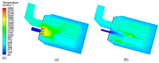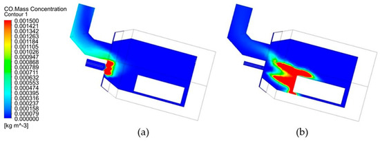 The model results shown in Figure 13 quantify the formation of CO emissions. Due to the small difference between achieved mass concentrations of CO based on the type of burner, the contour range had to be rescaled from 0 to 0.0015 kg m−3, which represents around 165 ppm CO. From the results of the simulation, it is evident that the area of CO formation is located specifically in the area of the flame. In the case of the air/fuel burner, a small part of the produced emissions is drawn into the stack by the exhaust fan. In the case of the optimized burner, the concentration of CO emissions drawn off into the stack is significantly lower.
