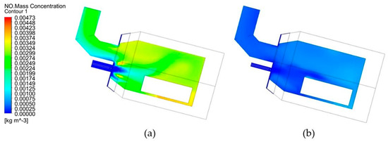 Model results: distribution of NO mass concentration contours. (a) OEC technology, (b) OEC technology +modification of burner.