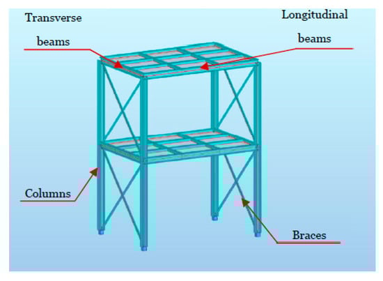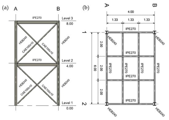 Because steel is the dominant material in Chile over a large part of the construction of structures and installations related to industrial activities, the type of structure to be modeled and analyzed seeks to represent a structural case usually seen in practice. The structure chosen represents the typical steel frame structures used in Chile in industrial and mining projects, and as can be seen, it is a structure of small dimensions in the sections of the beams and columns. At the same time, the case should be sufficiently exemplary, elementary, and representative, which is why a regular symmetrical structure was chosen with respect to the loads, resistance and stiffness, as well as the plan and height. Thus, a type of two-level open industrial platform was selected, as shown in Figure 1. The structure was modeled using Robot Structural Analysis Professional software [35], and it was subjected to the code’s prescribed dead, live, wind, and seismic loads. The structure is designed considering additional loads that correspond to a generic mechanical equipment bearing in the four points of the inner beams’ intersection at each level. The weight of the mechanical equipment located in both structural levels is 20 kN.