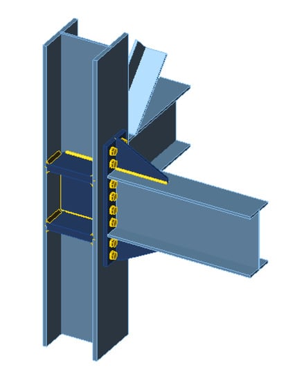 The same node, previously chosen for the design of the 8ES EPC using the spreadsheet, was selected jointly by all the structural members concurrent to it for its subsequent import into the IDEA StatiCa Steel (ISS) software framework [38]. This software uses its own innovative analysis method, namely, the component-based finite element model (MEFBC), which mixes two popular methods among engineers worldwide, the FEM and the component method (CM).