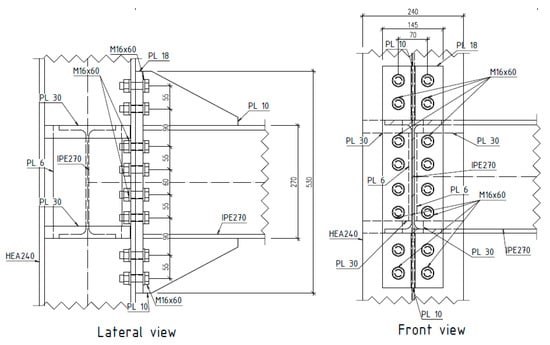 Lateral and front view of the pre-qualified connection designed. Dimensions in millimeters.