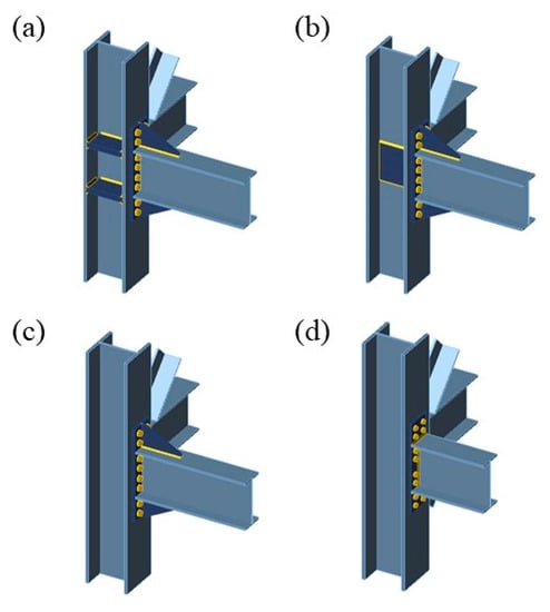 Isometric view of the 8ES EPC (a) only with continuity and stiffener plates (CP-ST), (b) only with double reinforcement and stiffener plates (DP-ST), (c) only with stiffener plates (ST) and (d) without reinforcement plate (NP) connections.