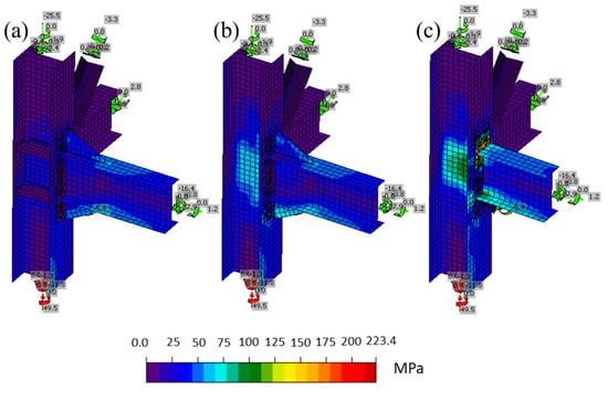 Equivalent stresses computed on the connection for the three 8ES EPC models: (a) CP-DP-ST, (b) ST, and (c) NP.